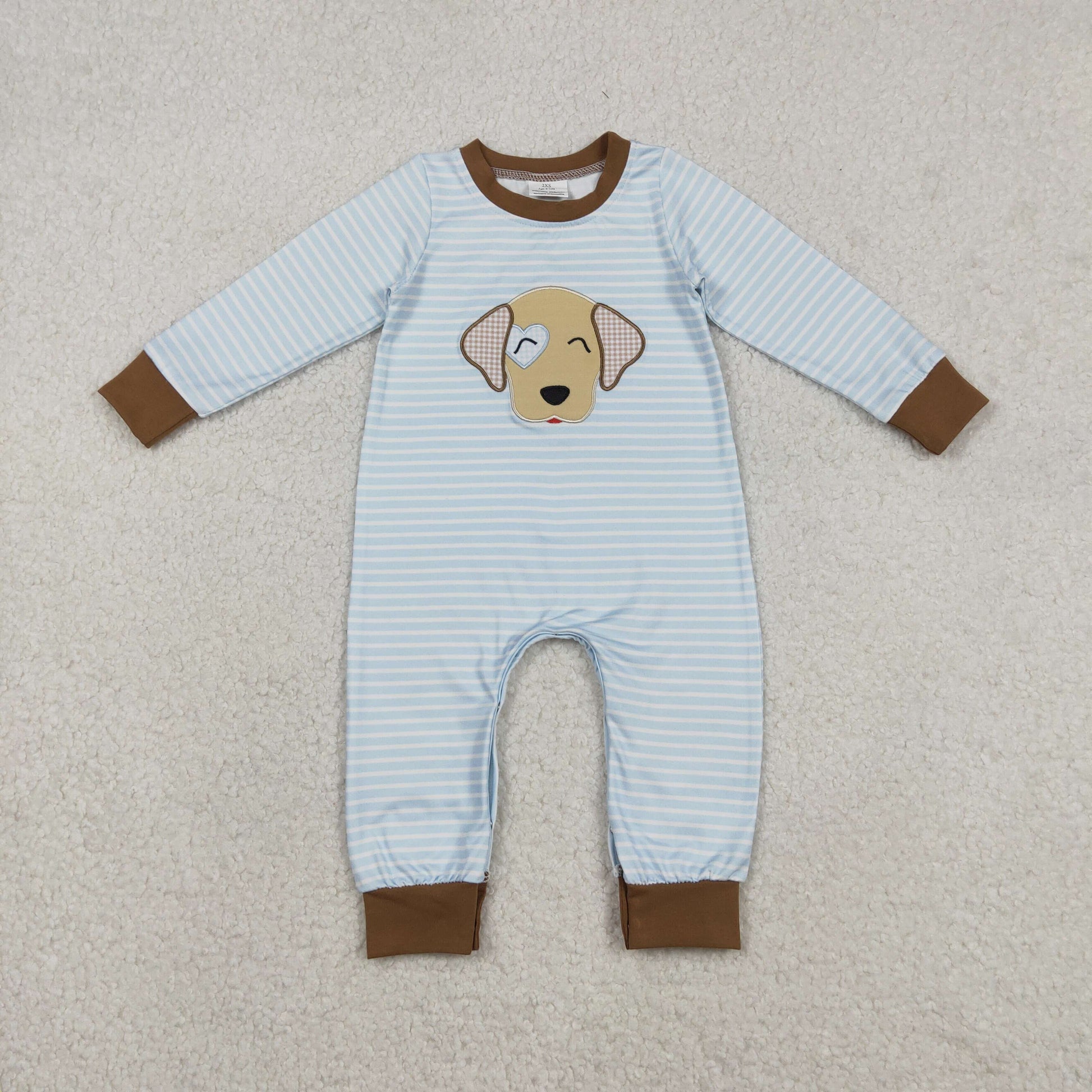 Valentine's Day Embroidery Dog Baby Boys Blue Stripe Footie Rompers Cute Infant Boys Outfit with Footies for Cozy Wear