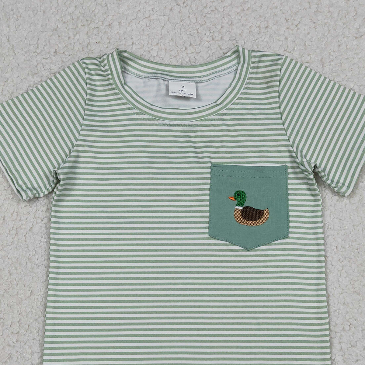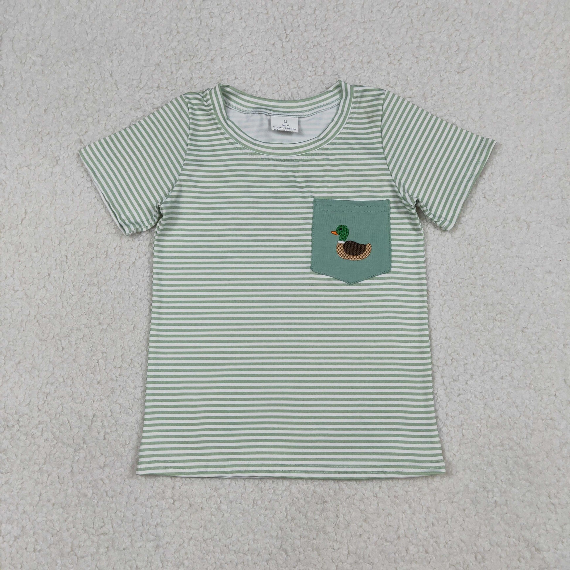 Baby Boys Green Stripe Pocket T-shirts Top Embroidery Duck Design Hunting Theme Casual Wear for Little Ones
