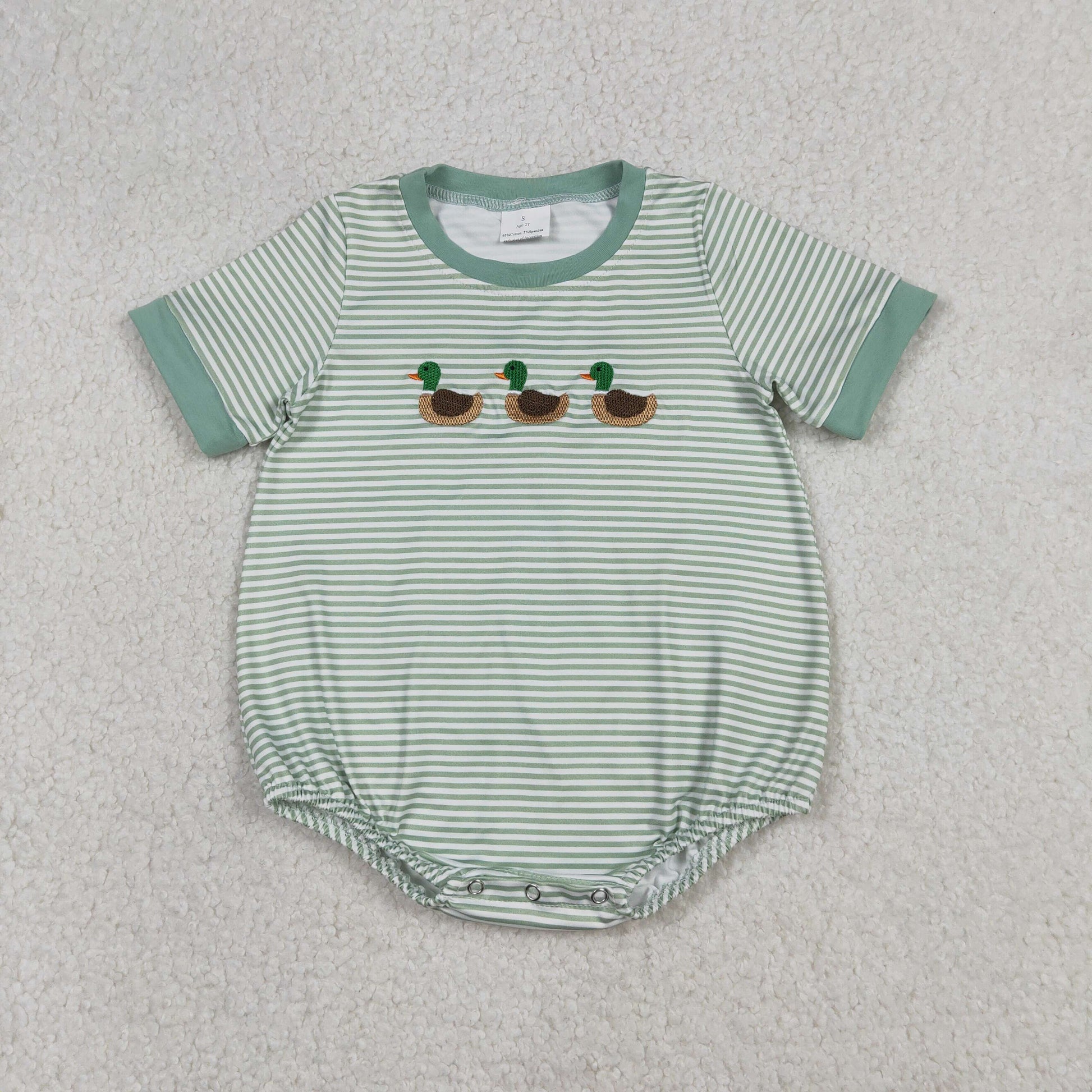 Baby Boys Green Stripe Short Sleeve Hunting Rompers Embroidery Ducks Design Comfortable And Stylish Clothing for Infants