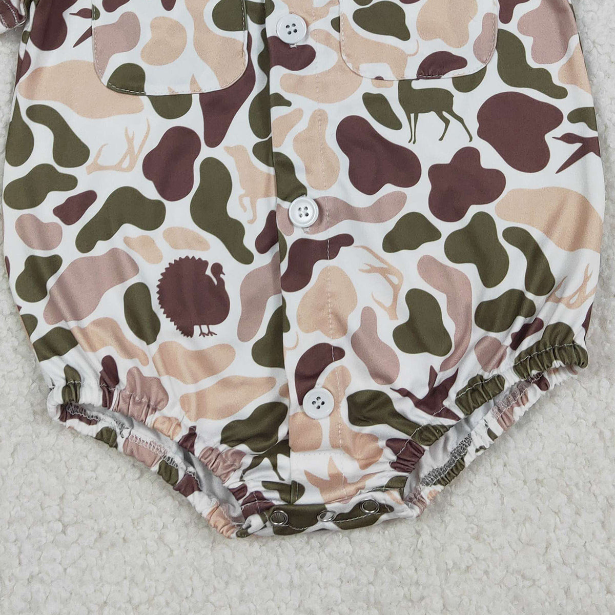 Baby Boys Camouflage Hunting Romper with Button Pockets Featuring Dogs Ducks Deer Print