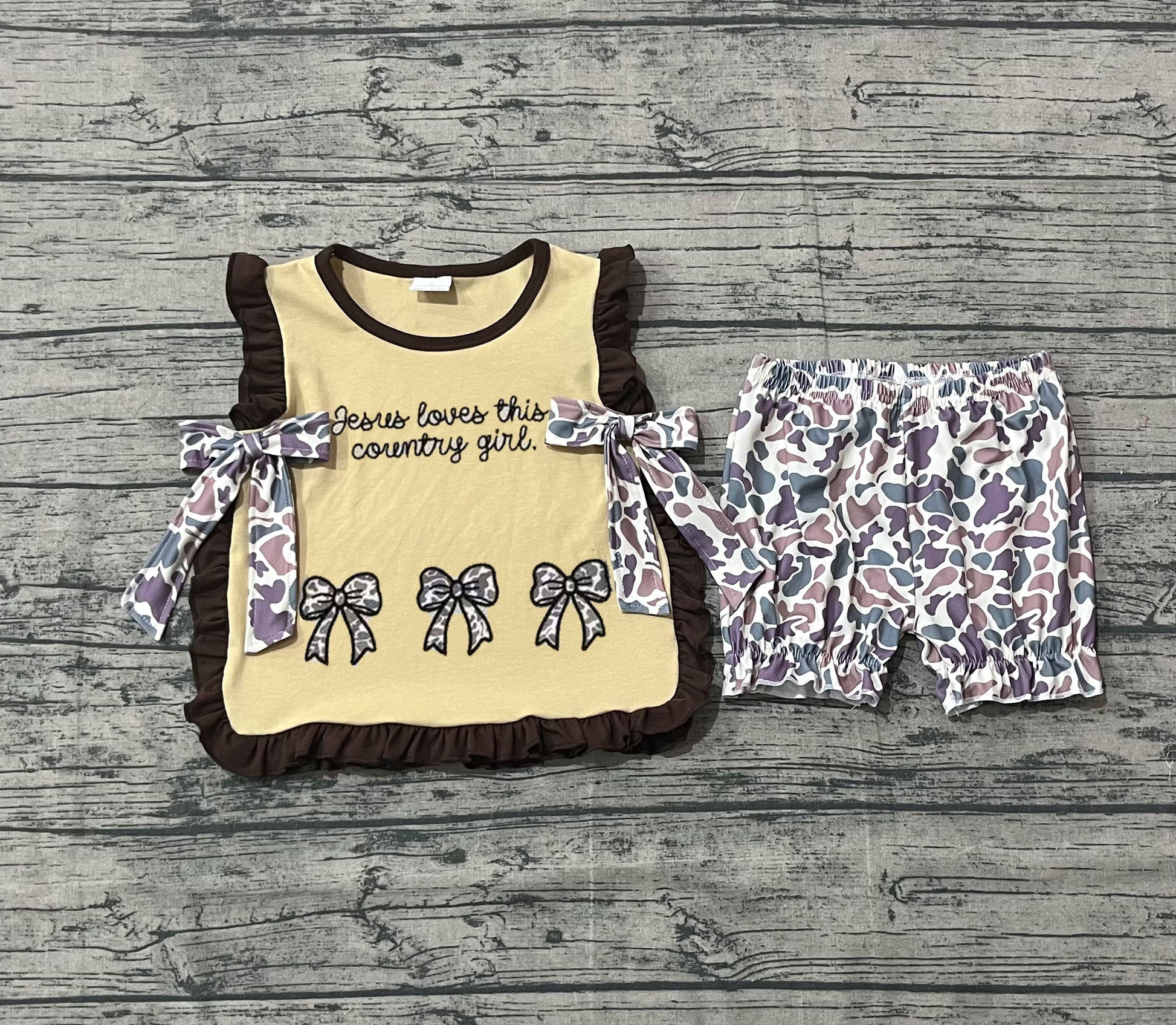 GSSO2730 Embroidery Jesus Love Me Camo Bows Baby Girls Top Ruffle Shorts Clothes Sets D 1206