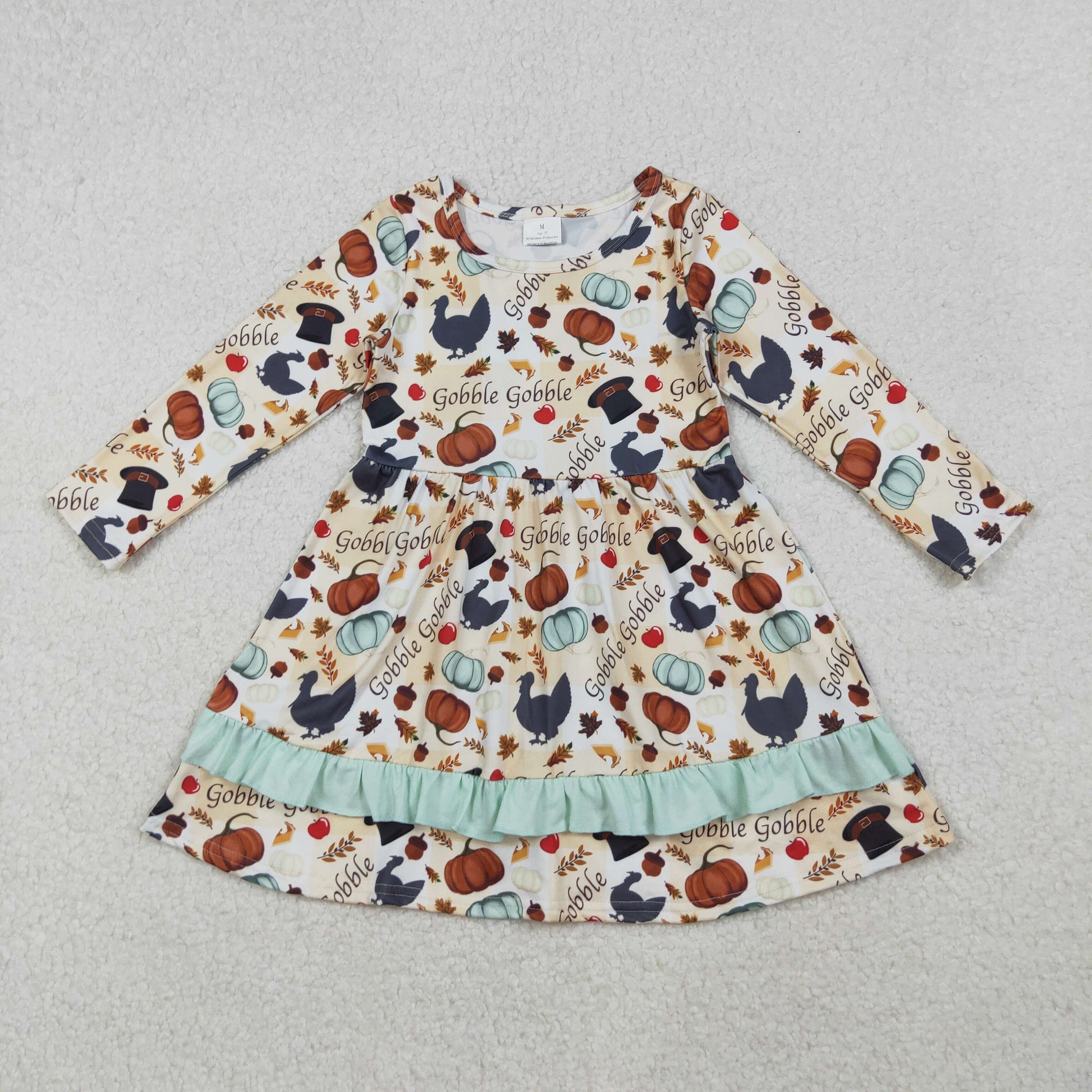 GLD0789 Turkey Pumpkin Green Lace Yellow Plaid Long Sleeve Dress D 1021