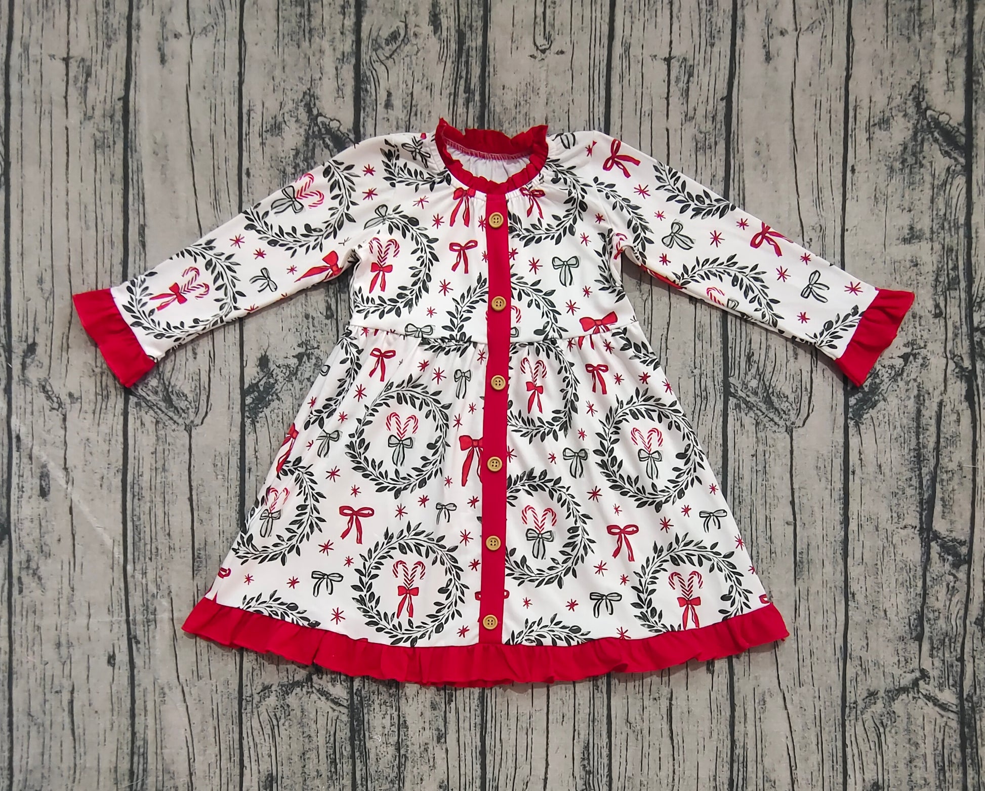 GLD1082 Baby Girls Long Ruffle Sleeves Green Red Bows Button Knee Length Dresses D 6.28