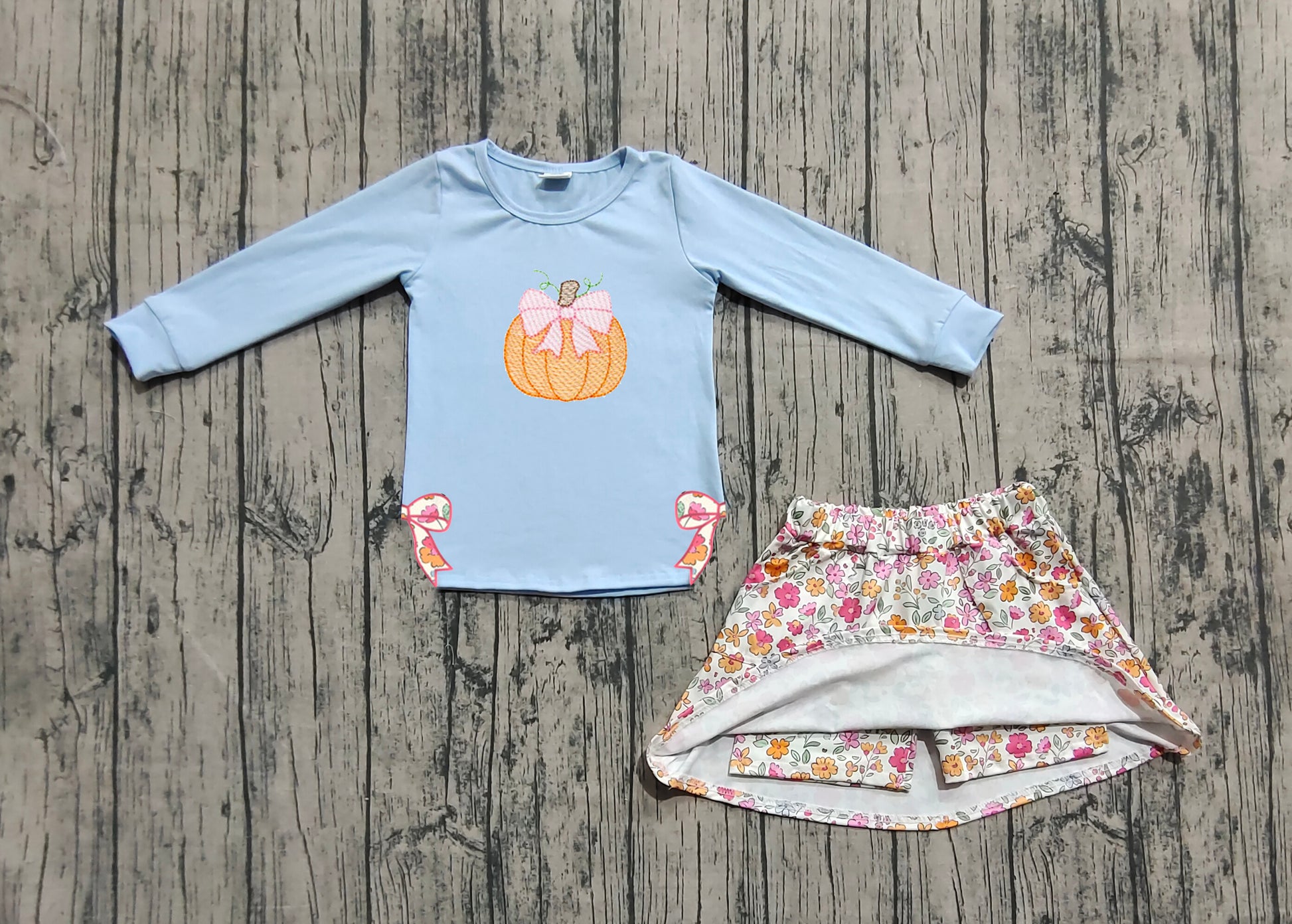 GLD1172 Baby Girls Blue Long Sleeves Bows Pumpkin Top Flowers Skorts Set D 903