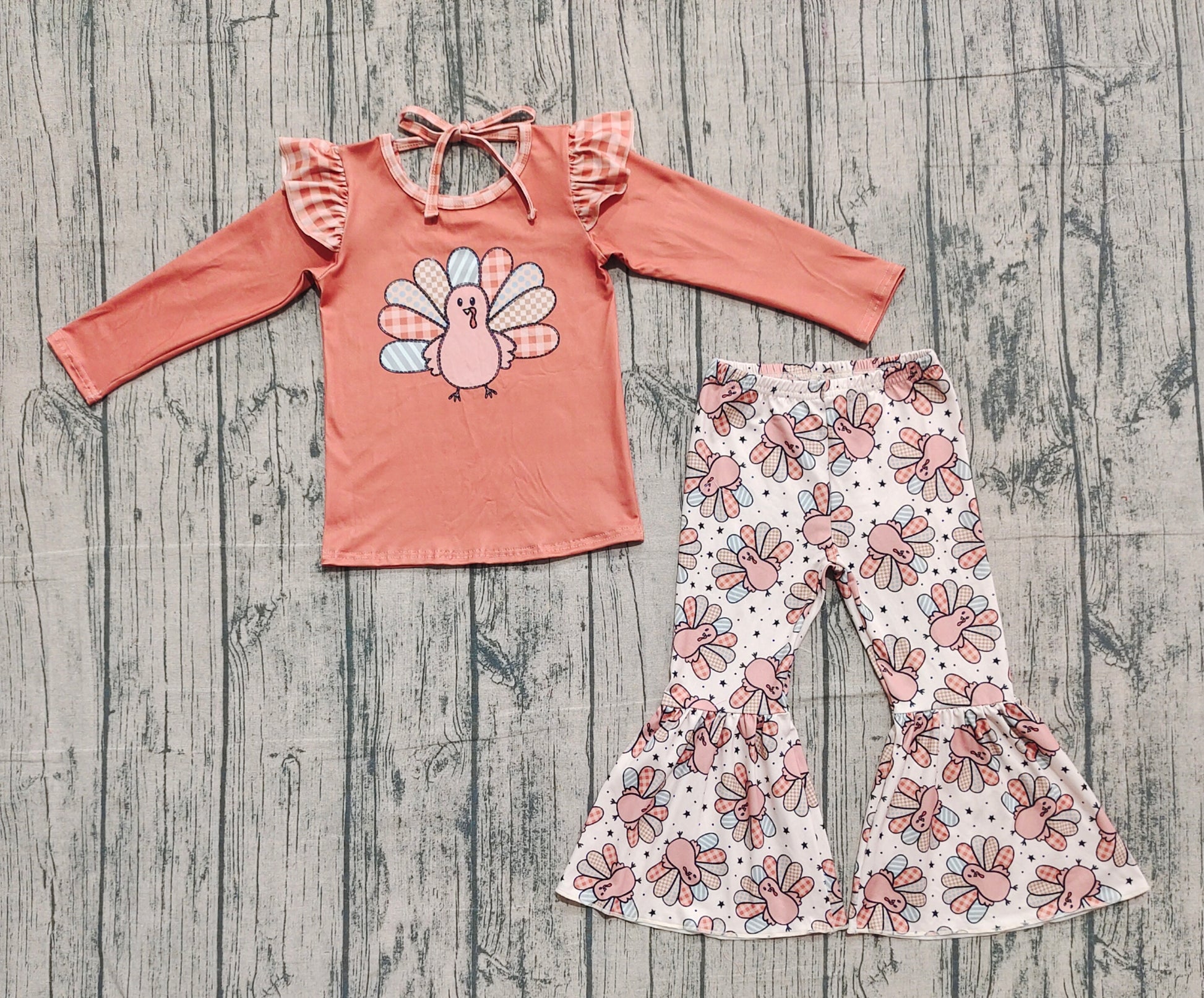 GLP2605 Baby Girls Khaki Long Sleeves Turkey Bows Top Bell Bottom Pant Set D 925