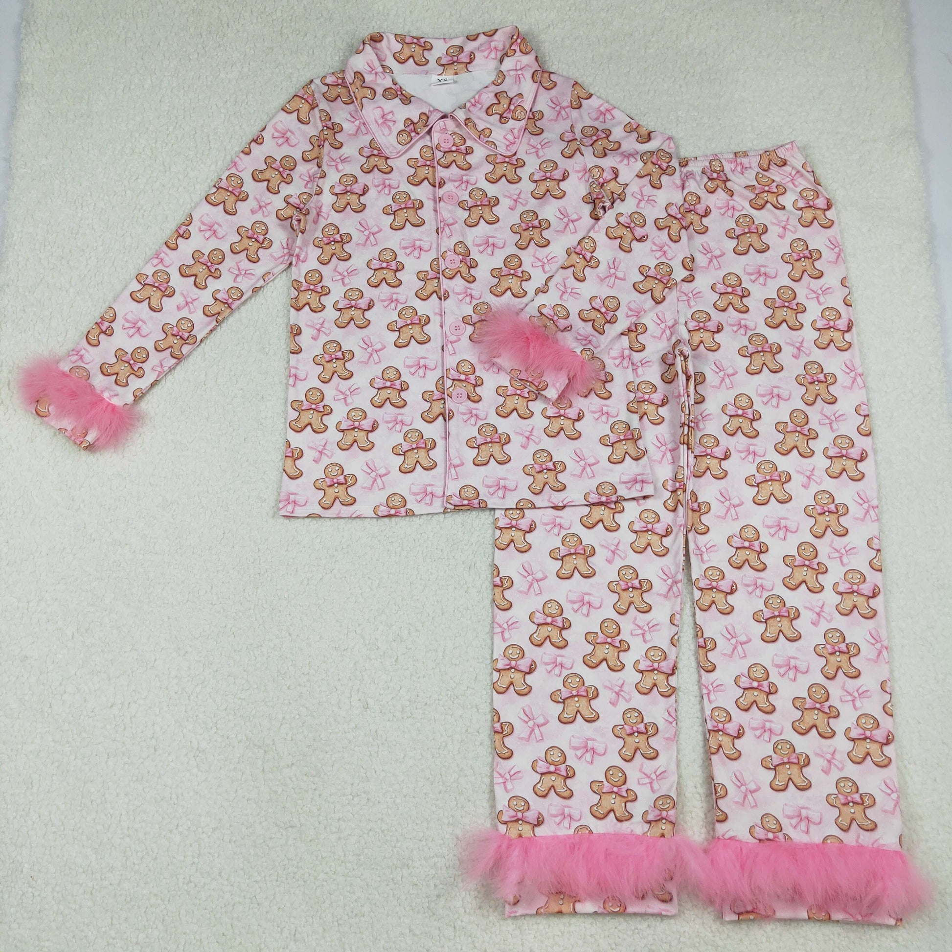 GLP2716 Adult Women's Gingerbread Man Pink Bow Pattern Plush Trim Long Sleeve Pants Pajama Set D 101