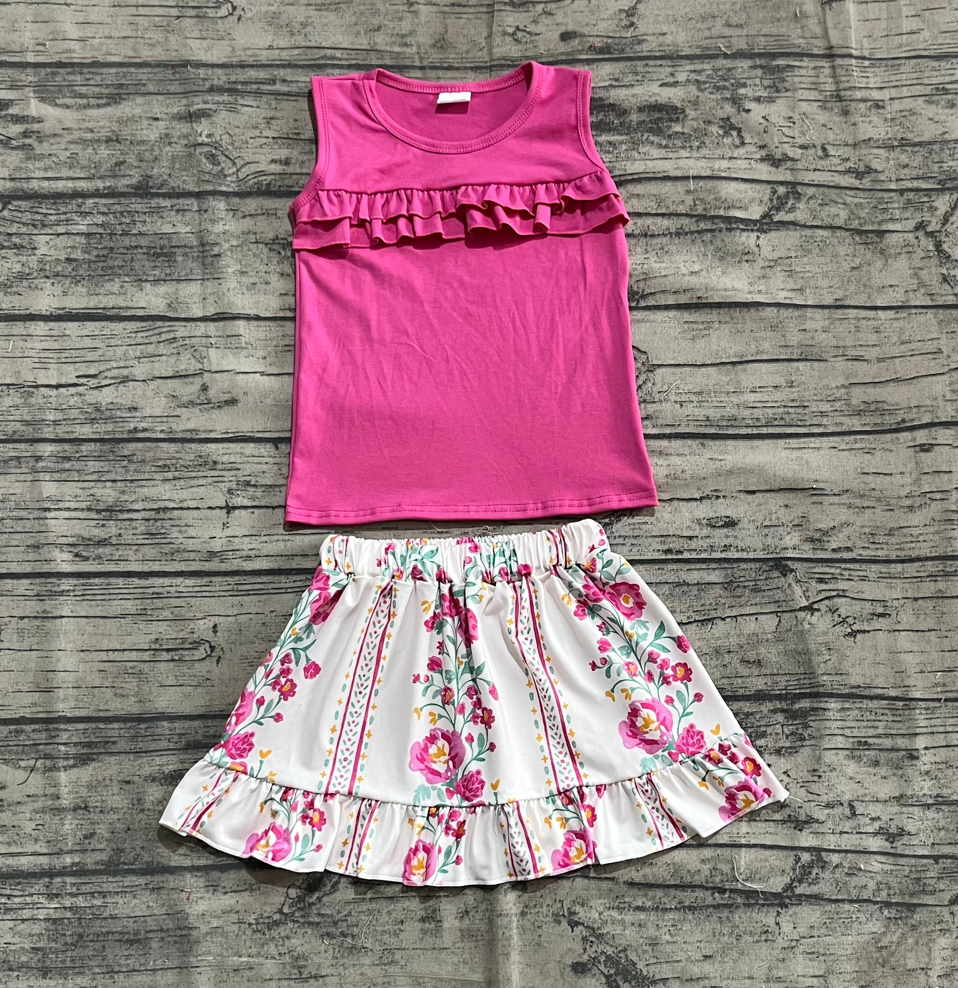 GSD2104 Solid Rose Red Sleeveless Flower Leaf Striped Skirt Set D 4.21