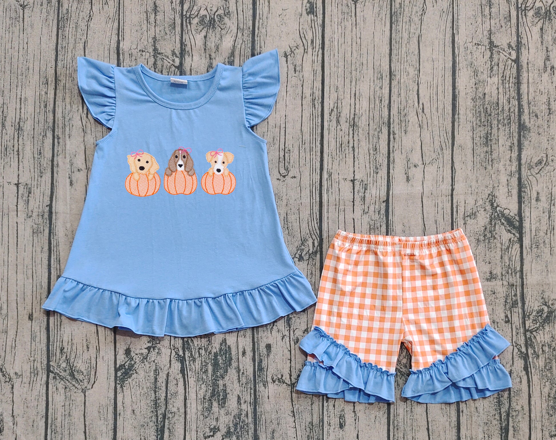 GSSO2700 Baby Girls Blue Flutter Sleeves Dogs Pumpkins Tunic Ruffle Shorts Set D 8.11