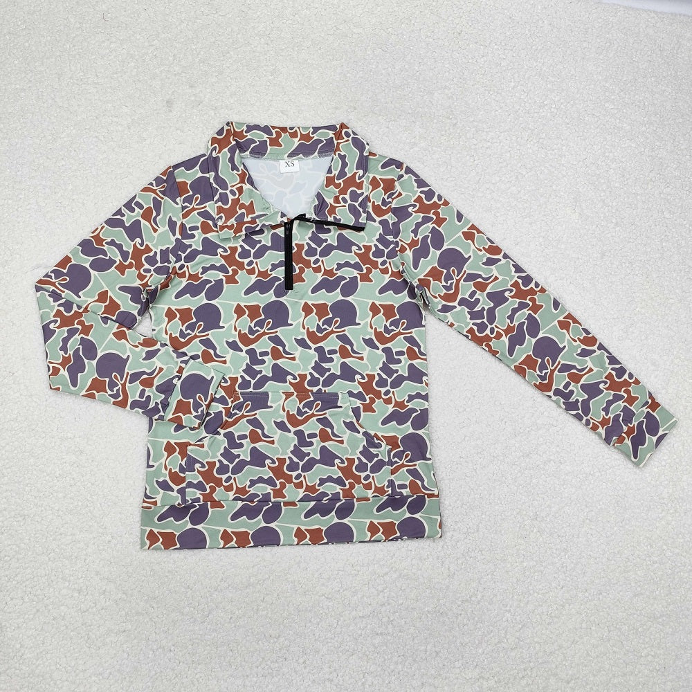 GT0833 Adult Women Pocket Camouflage Brown Green Zipper Long Sleeve Top