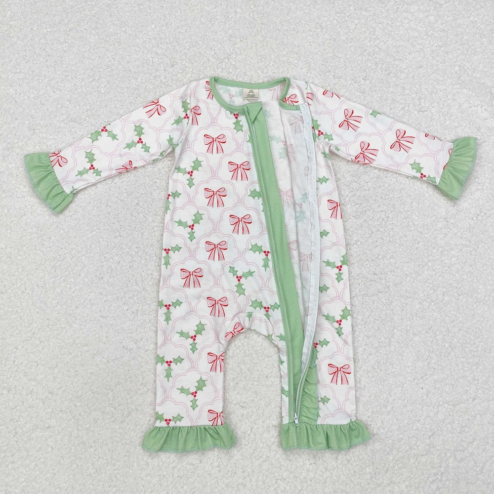 LR1344 BAMBOO Pink bow pattern leaves green lace white zipper long sleeve jumpsuit