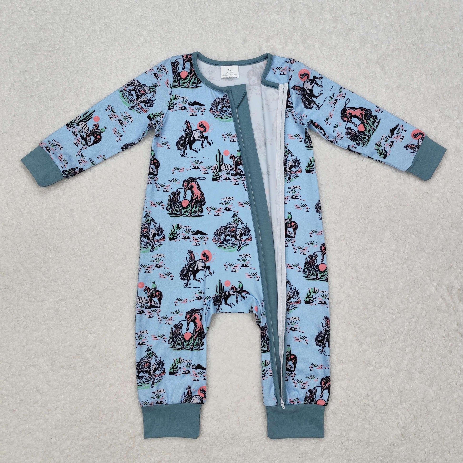 LR1578 Western Cowboy Horseback Riding Cactus Pattern Zipper Long Sleeve Bodysuit
