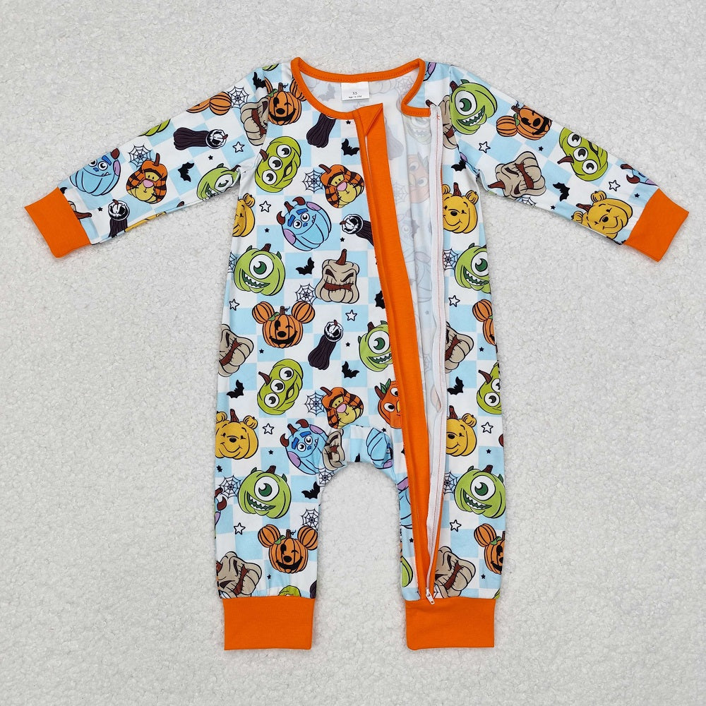 LR1650 Halloween Orange Trim Blue and White Plaid Zipper Long Sleeve Bodysuit