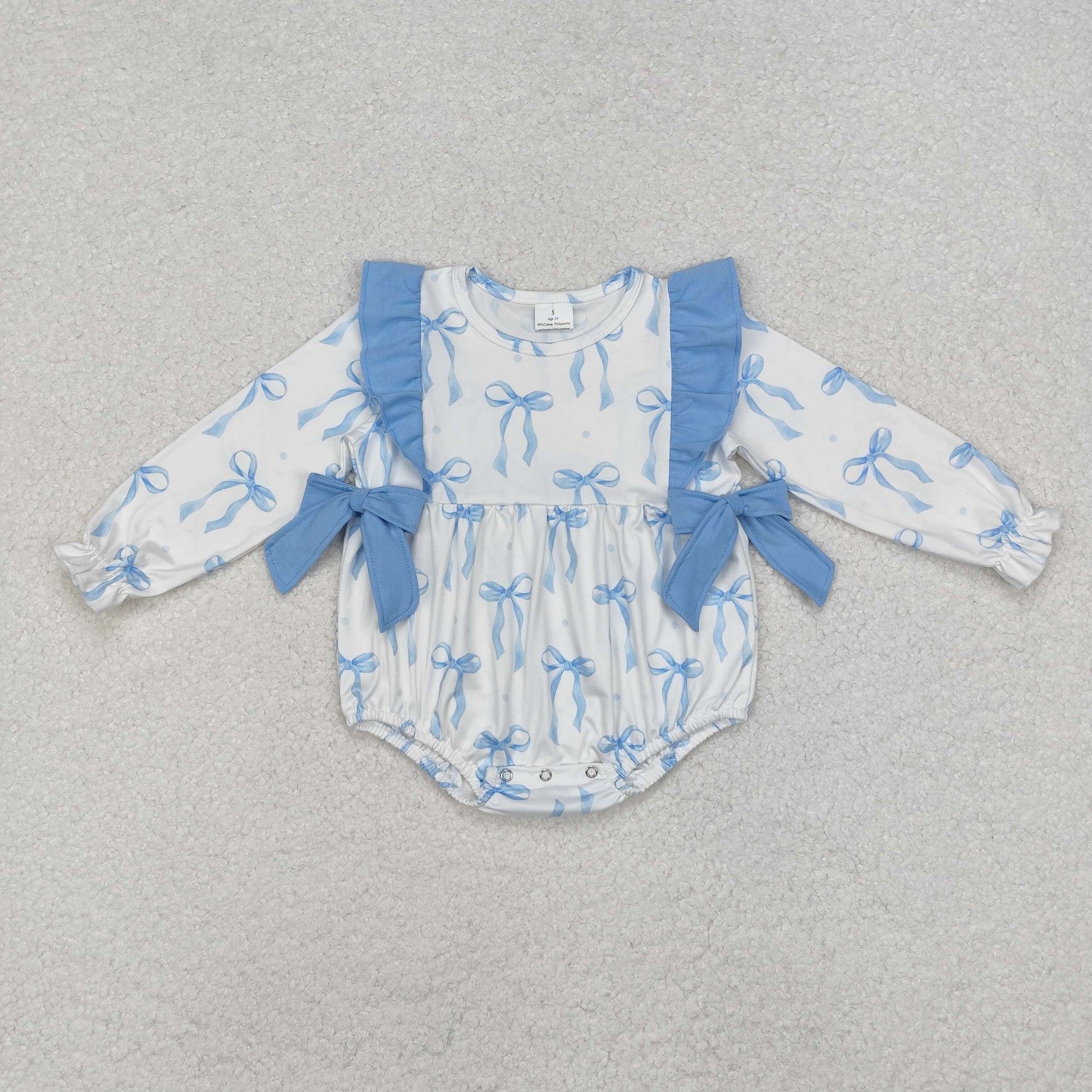 LR2043 White long-sleeved bodysuit with blue lace bow