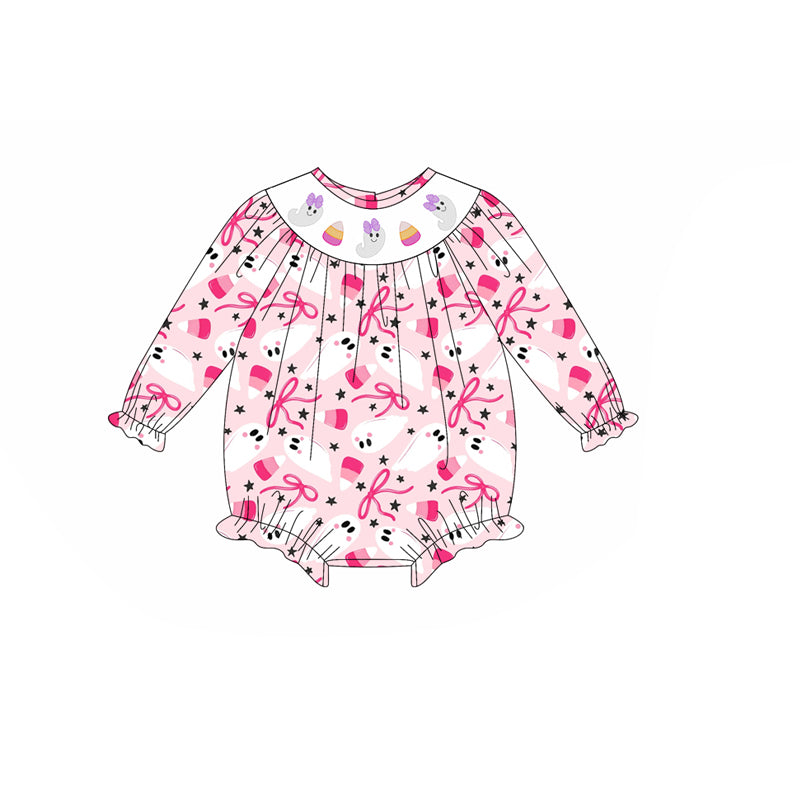LR2216 Ghost candy corn smocked bow girls Halloween romper D 901