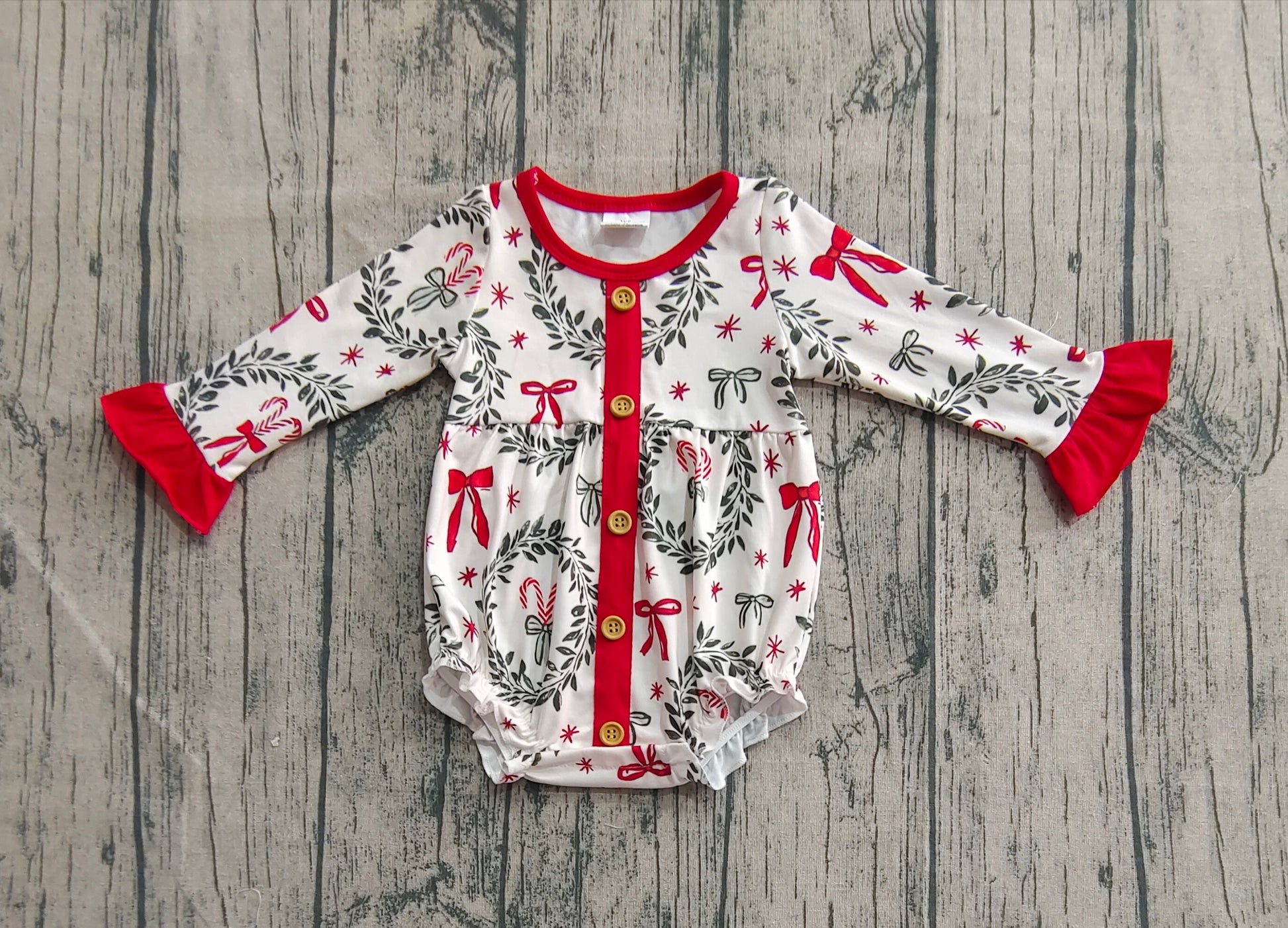 presale LR2252 Baby Girls Long Sleeves Red Green Bows Button Ruffle Rompers D 5.24
