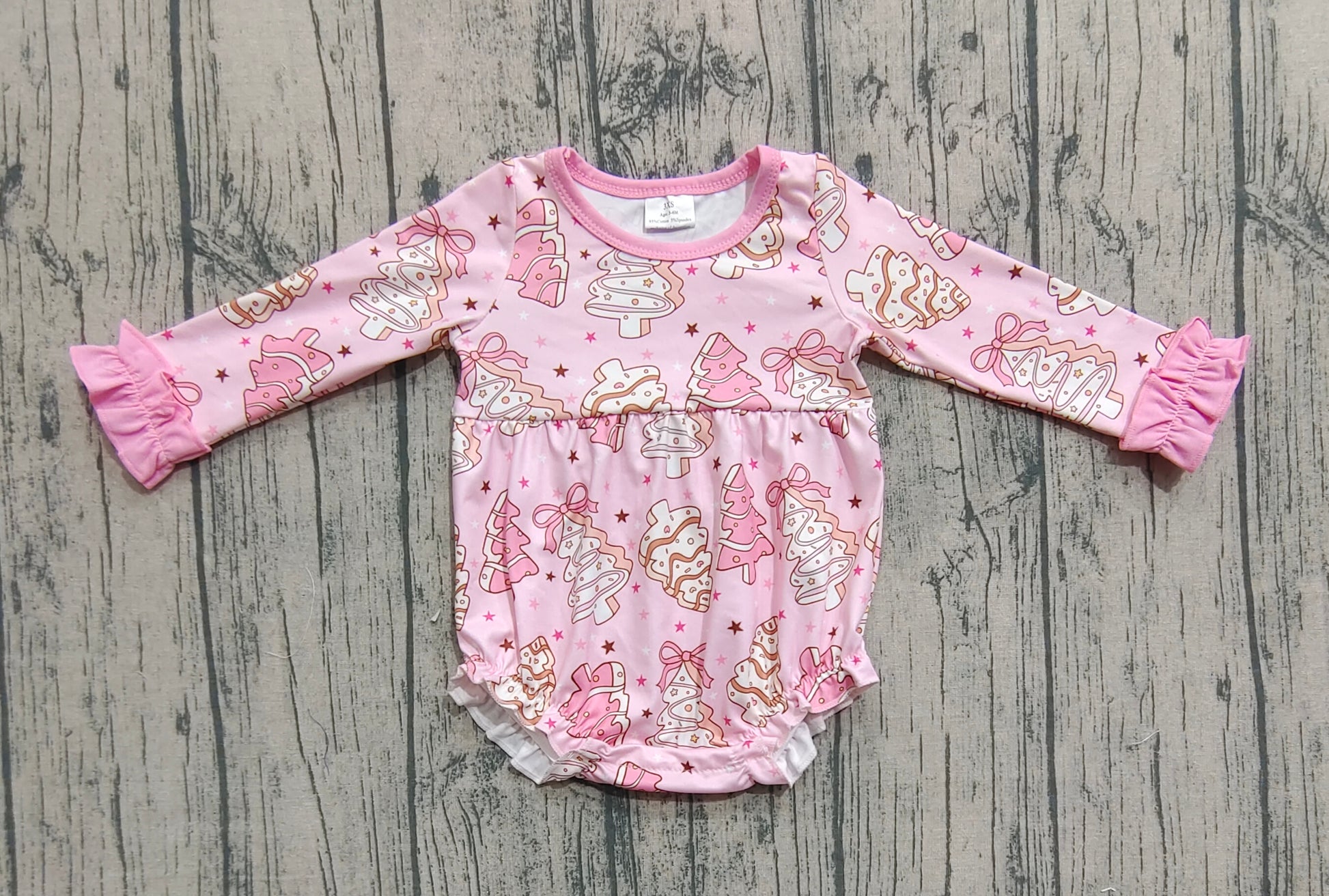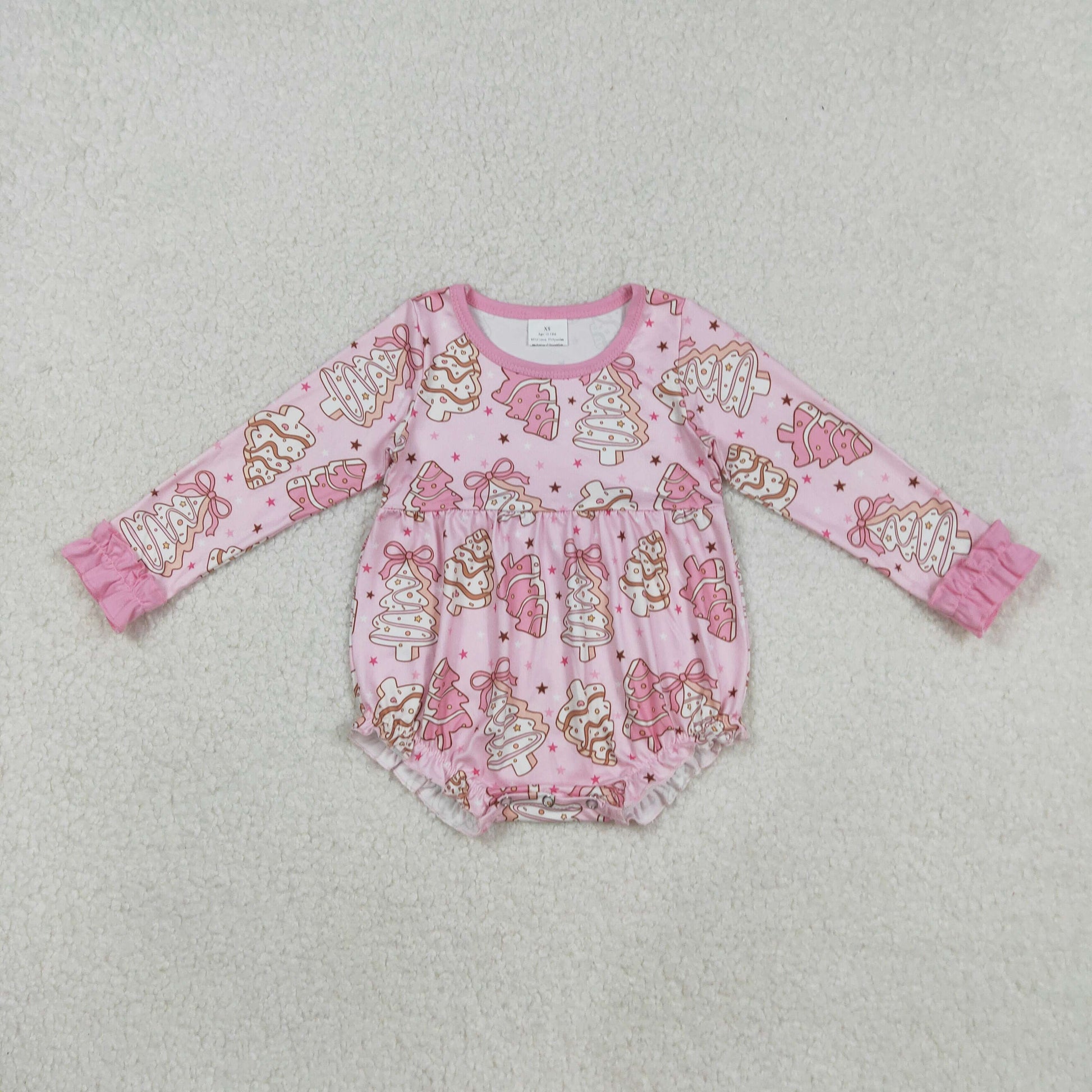 LR2301 Baby Girls Long Ruffle Sleeves Pink Bows Christmas Trees Plaid Rompers D 908