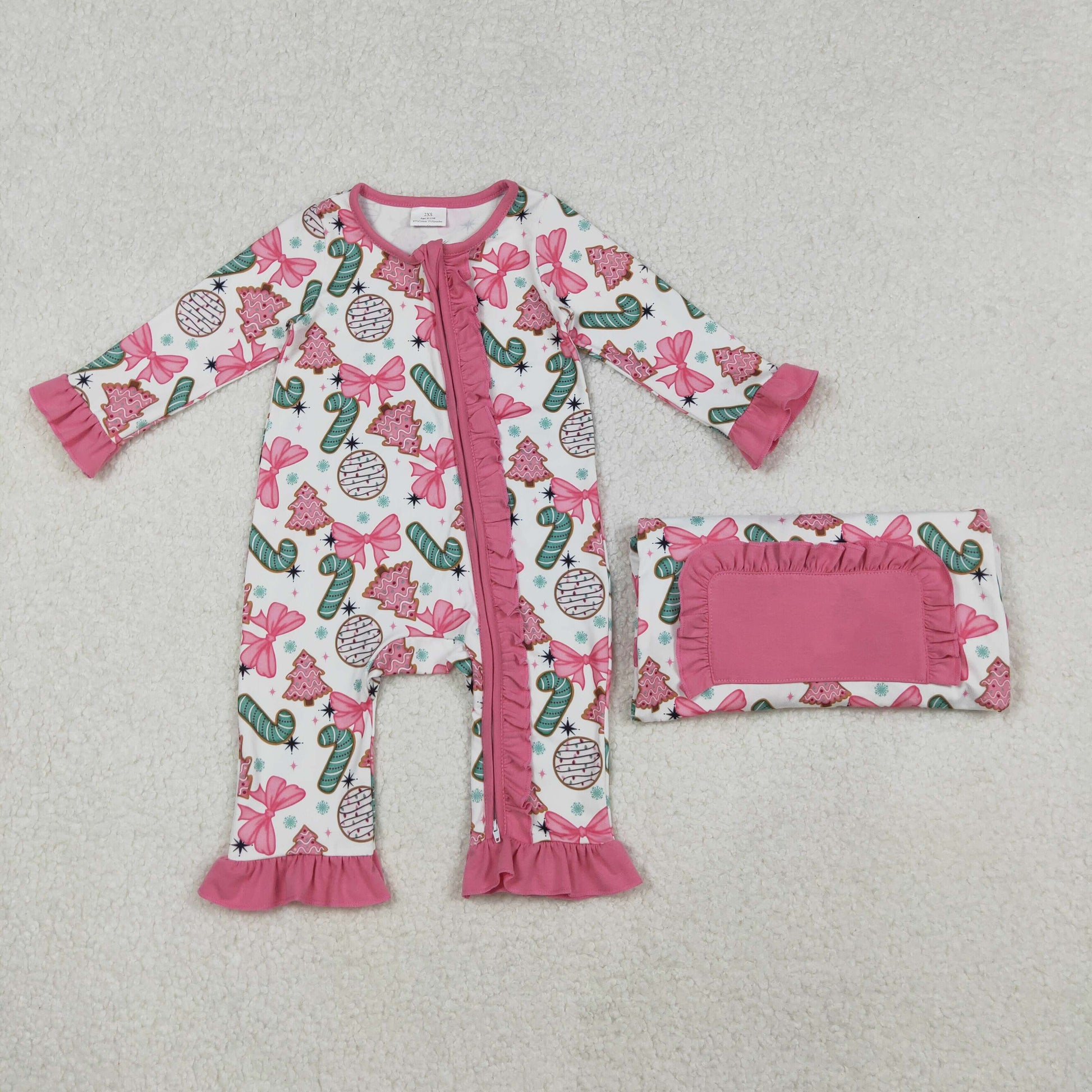 LR2486 Baby Girls Long Sleeves Christmas Trees Candy Cane Ruffle Zipper Rompers D 1023