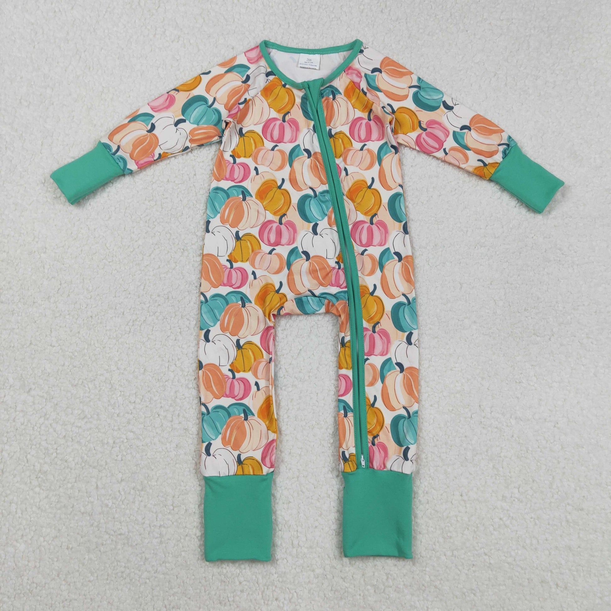 LR2552 Baby Girls Colorful Pumpkins Plaid Fall Zipper Footie Rompers D 8.7