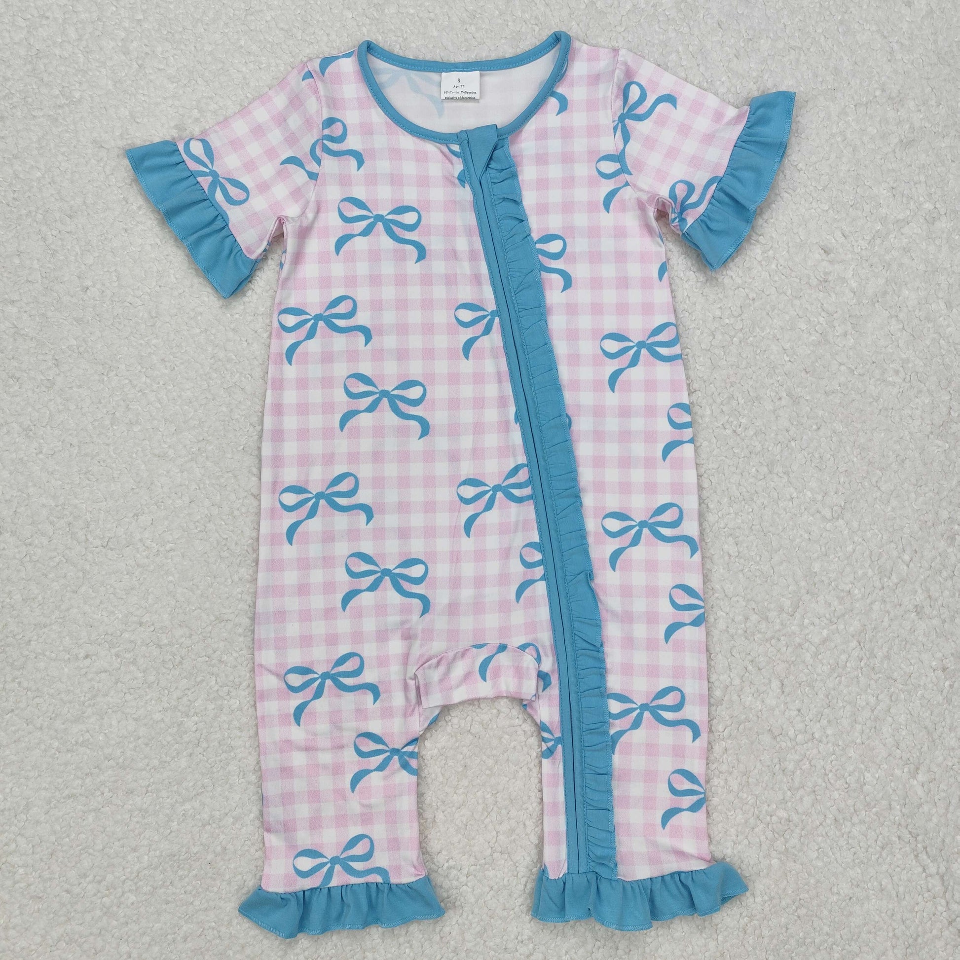 SR2026 Bow Pattern Blue Lace Pink Plaid Zipper Short Sleeve Bodysuit