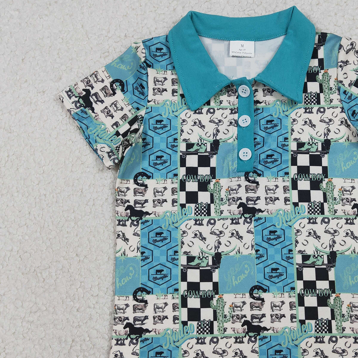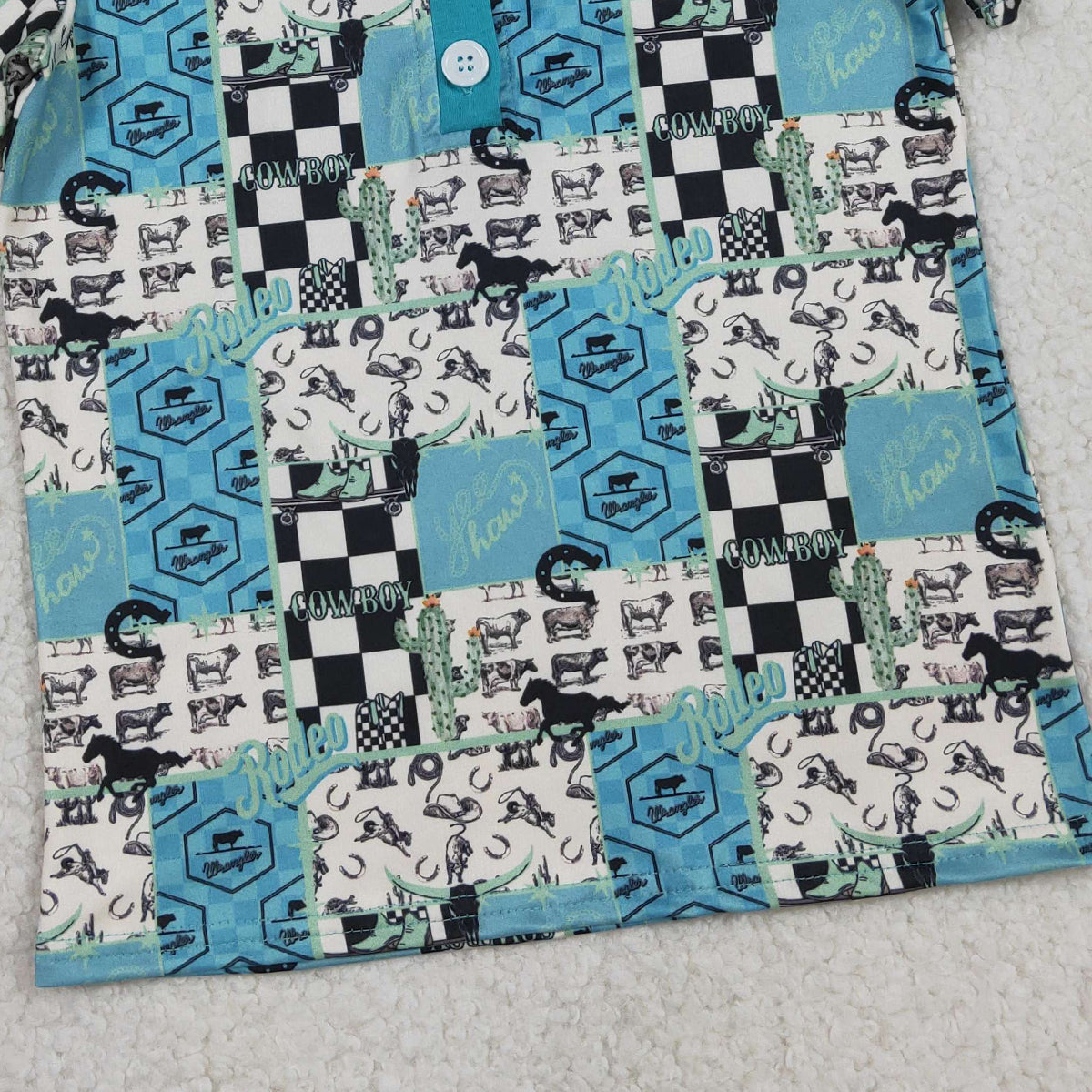 RTS NO MOQ(In Stock) BT1631 Rodeo Letter Cactus Riding Pedal Plaid Button Neck Short-Sleeve Top